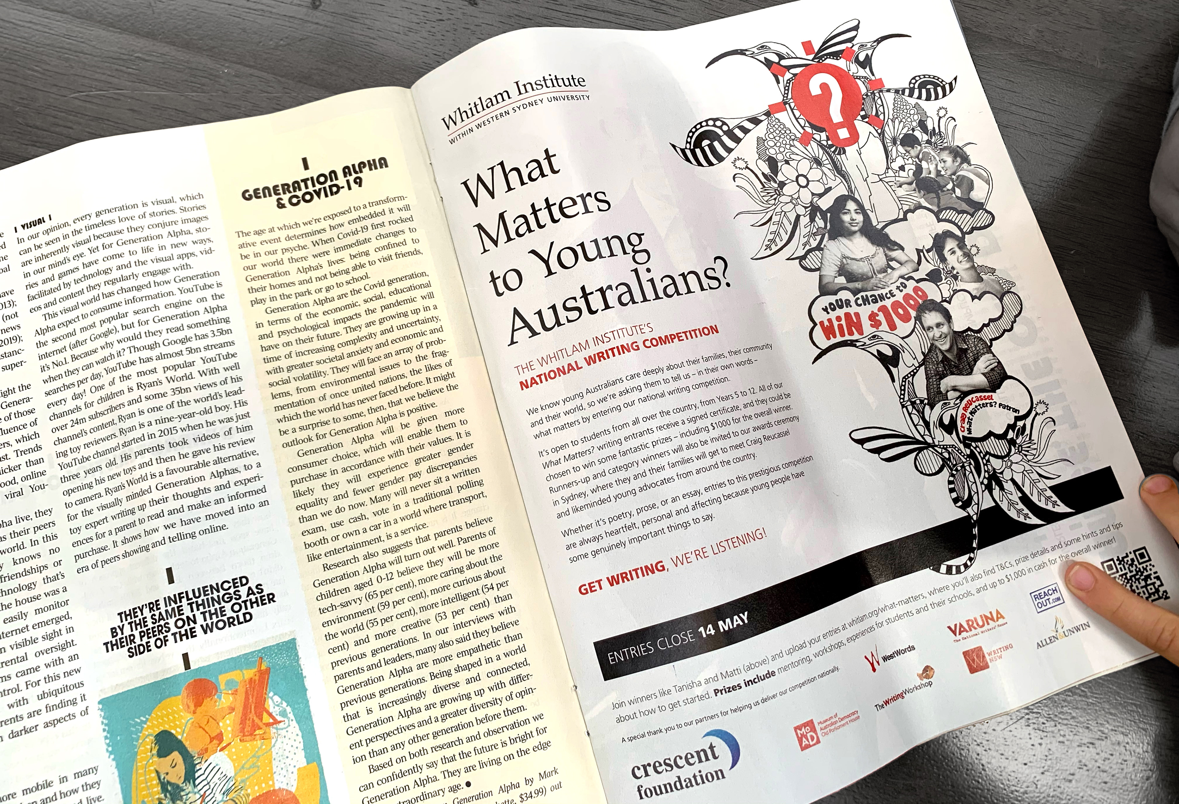 Create a style and collateral utilising the existing 'What Matters' logo for Whitlam Institute's youth writing competition.